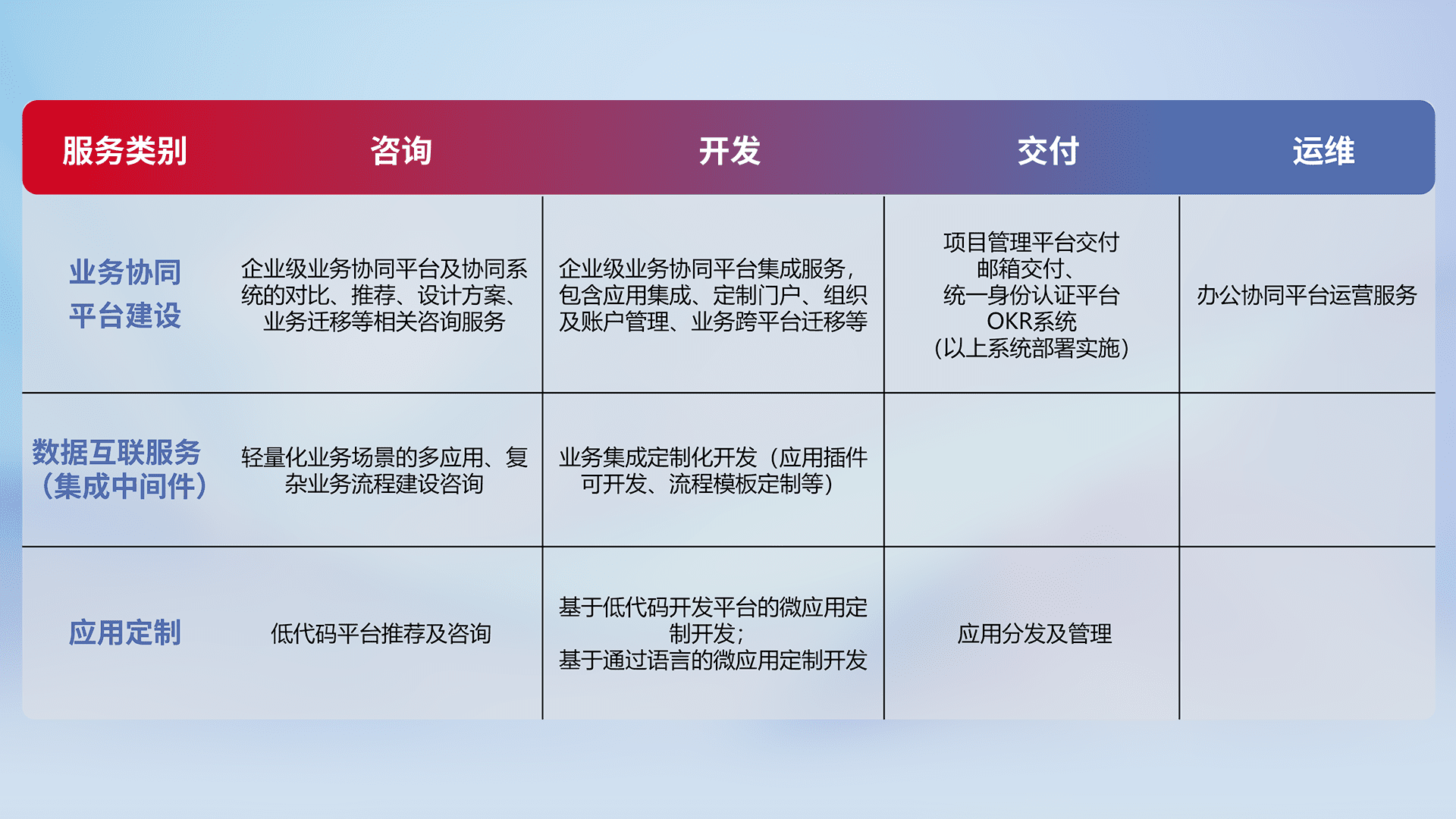 针对钉钉、、、、企微、、IDaas等平台级产品提供产品的规划、、方案、、、交付、、定制化开发等服务,,,,实现如统一协同办公、、智能客户服务、、、混合会议管理、、智能数据查询、、、等业务场景,,实现数字化转型。。。。